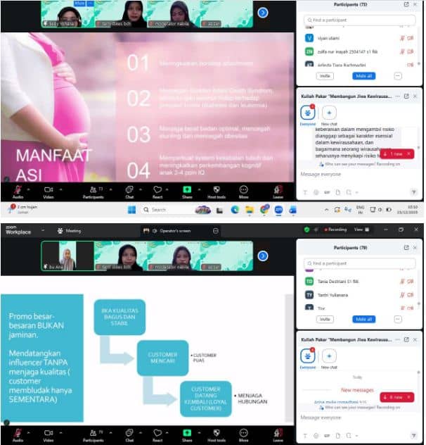 Dalam pemaparannya, Ana Aldilah Istiqfara menjelaskan tentang peluang dan tantangan kewirausahaan di bidang pelayanan kesehatan, khususnya natural therapy untuk ibu dan bayi. Ia membagikan pengalaman praktik serta strategi membangun usaha yang berkelanjutan dengan tetap mengedepankan aspek keselamatan, kenyamanan, dan kualitas pelayanan kesehatan.